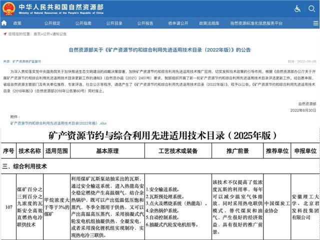 2025年11月27日,自然资源部正式发布《矿产资源节约与综合利用先进适用技术目录(2025年版)》。北京君发科技集团有限公司(以下简称“君发科技”)与安徽理工大学联合研发的“煤矿百分之三到百分之九浓度的瓦斯安全高效直燃热电冷联供技术”成功入选。这是继2022年后,该技术再度获得国家认可。
