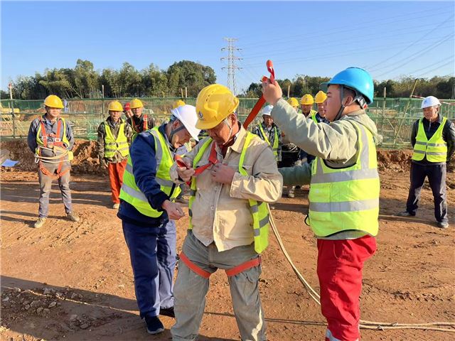 针对建筑施工中高处坠落的高风险点,培训人员直接在作业现场手把手教学——从防护装备的穿戴检查,到双钩安全绳的规范挂设,逐一演示、逐个纠正,确保每位施工人员“学得会、用得对”。让“安全第一”的理念深植人心。