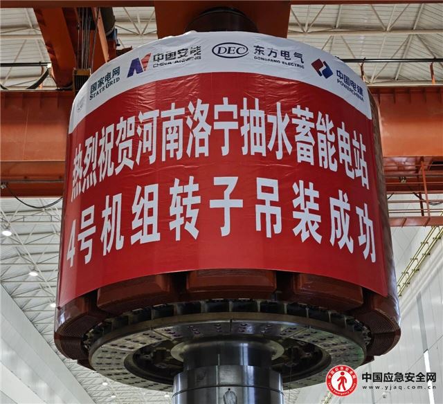本网讯(通讯员 徐迎华 曾威华 张松峰)11月8日上午9时,在河南洛宁抽水蓄能电站地下厂房内,随着现场总指挥一声令下,两台300吨桥机协同作业,将重达425吨的4号机组转子平稳吊起。经过90分钟精准操作,转子于10时30分准确落入机坑预定位置,标志着洛宁抽水蓄能电站最后一台机组核心部件安装完成阶段性目标,为2026年实现全面投产发电奠定坚实基础。