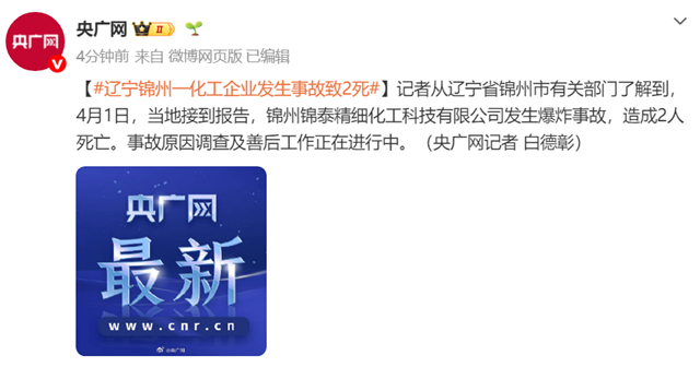 记者从辽宁省锦州市有关部门了解到,4月1日,当地接到报告,锦州锦泰精细化工科技有限公司发生爆炸事故,造成2人死亡。事故原因调查及善后工作正在进行中。(央广网记者 白德彰)