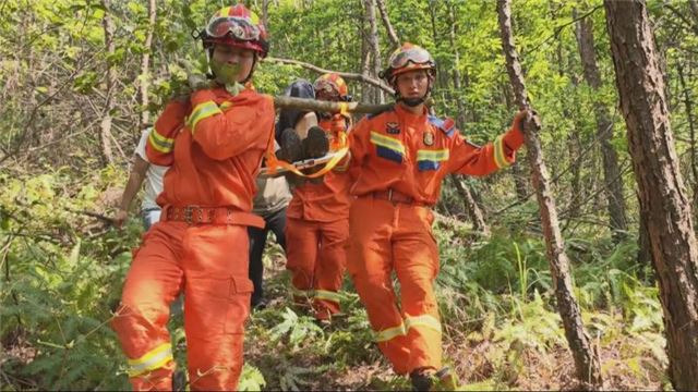 消防救援人员带上担架、绳索、电锯等救援器材徒步上山。途中,消防救援人员一边通过手机联系同行人员,了解2名人员所在位置,一边持续大声喊话。
