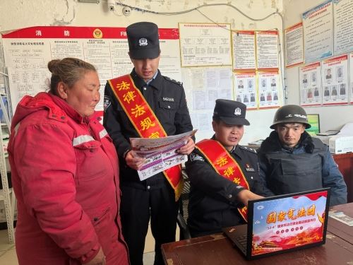牧民居住分散是辖区的显著特点,移民管理警察们特意组建流动宣传队,驱车或徒步前往偏远村落和牧民定居点,走进群众家中开展“面对面”宣传。在牧民毡房里、农家院落中,民警们围坐在一起,用双语将宪法中关于公民基本权利与义务、婚姻家庭、财产保护、养老保障等条款,转化为群众听得懂的家常话。同时,通过笔记本电脑播放自制的动画短片和双语普法音频,把抽象的法律条文融入生活场景,让老人孩子都能看得明白、听得进去。对于行动不便的群众,民警们主动上门送学,耐心讲解相关权益保障知识,让每一位群众都能感受到法律的关怀。