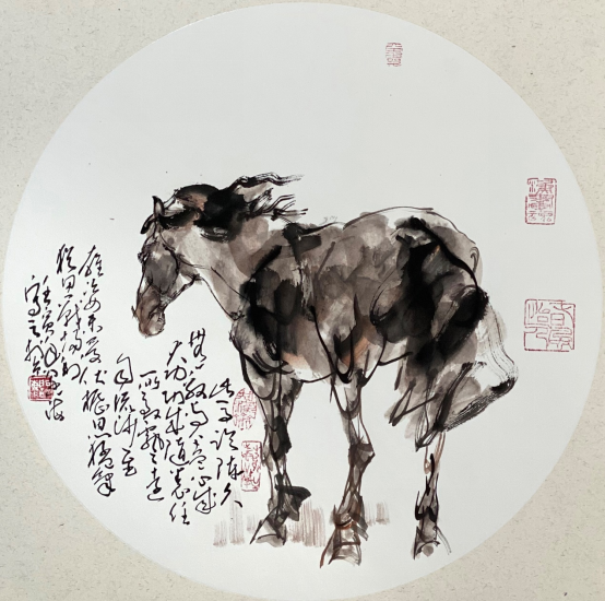 依此理论与中国画笔墨相结合,就会明确线往哪里勾,墨往哪里落,很有可操作性,使我的学生受益匪浅。这些年来我的驴、马、牛、羊、老虎的写意画都是以此理论而画的,对前人有了突破性发展;4.文人画的品质。长期以来我始终坚持文人画诗、书、画、印四者并举的修行路线,来提高我的新汉画艺术品质、品位、品格。从南宋梁楷的《泼墨仙人图》,到八大山人、徐谓、张大千的泼墨没骨画法,来汲取营养。我的新汉画没骨画法既来自于传统、又有新的技法突破。若讲新汉画的创新我是自创一派,但对于恪守文人画的人文品质我又是保守一派。