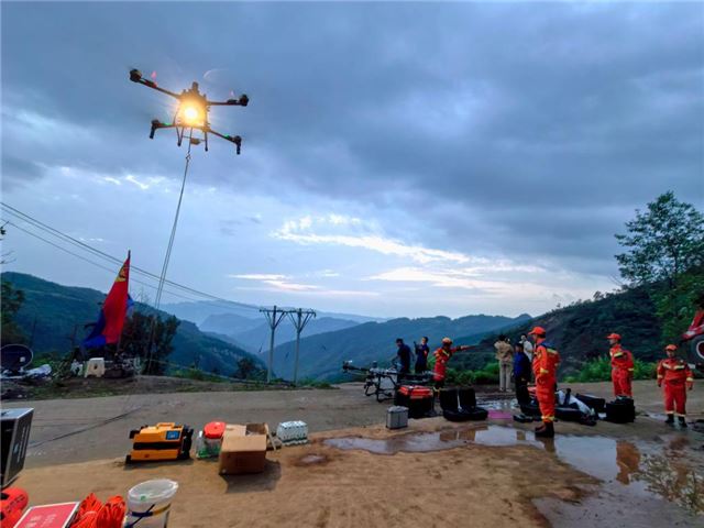 因强降雨造成多处道路塌方,消防人员采取徒步挺进的方式进入滑坡体核心区域。交通中断,消防人员就利用载重100公斤的无人机,将救援设备和物资空运到救援现场。