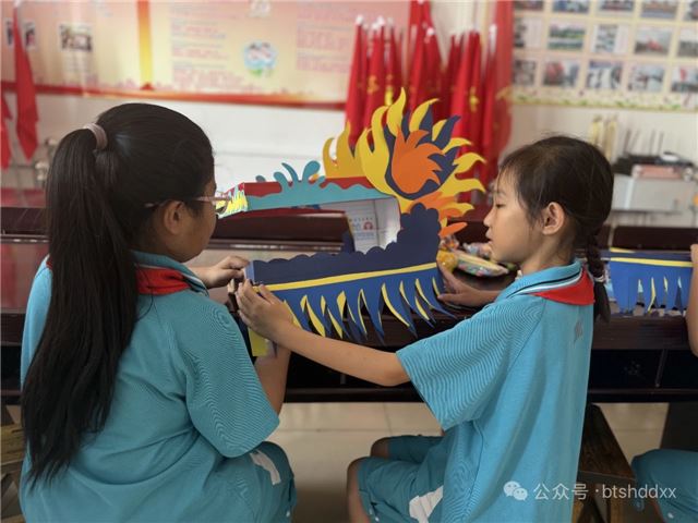 活动室里充满了浓厚的文化氛围。学生们围坐在一起,专注地参与手工制作活动。桌上摆放着各类材料,同学们发挥创意,一起制作端午节主题旱地龙舟的手工制品,从初步设计到细节装饰,每一步都体现出对传统文化的用心。