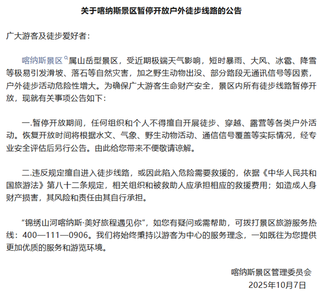 10月7日上午,喀纳斯景区管理委员会发布《关于喀纳斯景区暂停开放户外徒步线路的公告》,提醒广大游客及徒步爱好者,景区暂停开放期间,任何组织和个人不得擅自开展徒步、穿越、露营等各类户外活动。违反规定擅自进入徒步线路,或因此陷入危险需要救援的,依据《中华人民共和国旅游法》第八十二条规定,相关组织和被救助人应承担相应的救援费用;如造成人身财产损害,其风险和责任由其自行承担。