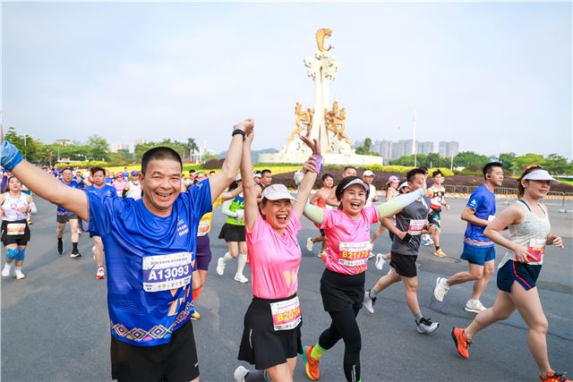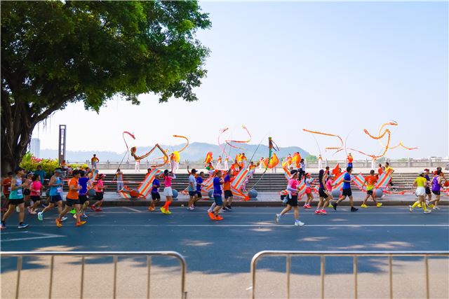 本次赛事围绕“非遗传承+活力展演”主线,在沿线设置6个特色氛围展演点,将传统文化与现代潮流完美融合。三龙大道转盘处,醒狮腾跃起舞、气势昂扬,为参赛跑者加油助威。百年骑楼城内,粤剧演员盛装亮相,婉转唱腔与经典身段尽显岭南戏曲韵味。金曲联唱唤起城市情怀,彩带龙翻飞舞动,赛道之上,千年岭南文化与现代体育活力交相辉映。