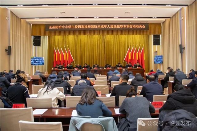 本网山西讯(郭晋成 通讯员刘生锋 安洋)12月24日,山西临县召开防治中小学生校园欺凌和预防未成年人违法犯罪专项行动动员会。县委常委、政法委书记、统战部部长赵小峰,政府副县长雒丽霞出席会议并讲话。政府副县长、教育局局长陈国民,县人民法院代院长王晓强,县人民检察院检察长王宝和出席会议。县委政法委、教体局、卫健局、公安局、司法局、民政局、检察院、法院、文旅局、市场监督管理局、团委、妇联、残联主要负责人员及相关负责同志参加本次会议。